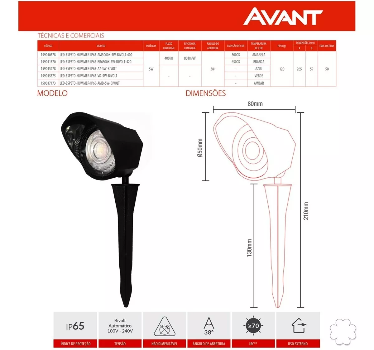 O ESPETO HUMMER IP65 AVANT é hermeticamente vedado com índice de proteção IP65, podendo assim ser utilizado em áreas externas, como jardins e canteiros.