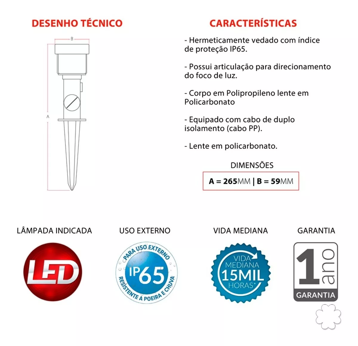 – Índice de proteção: IP 65;